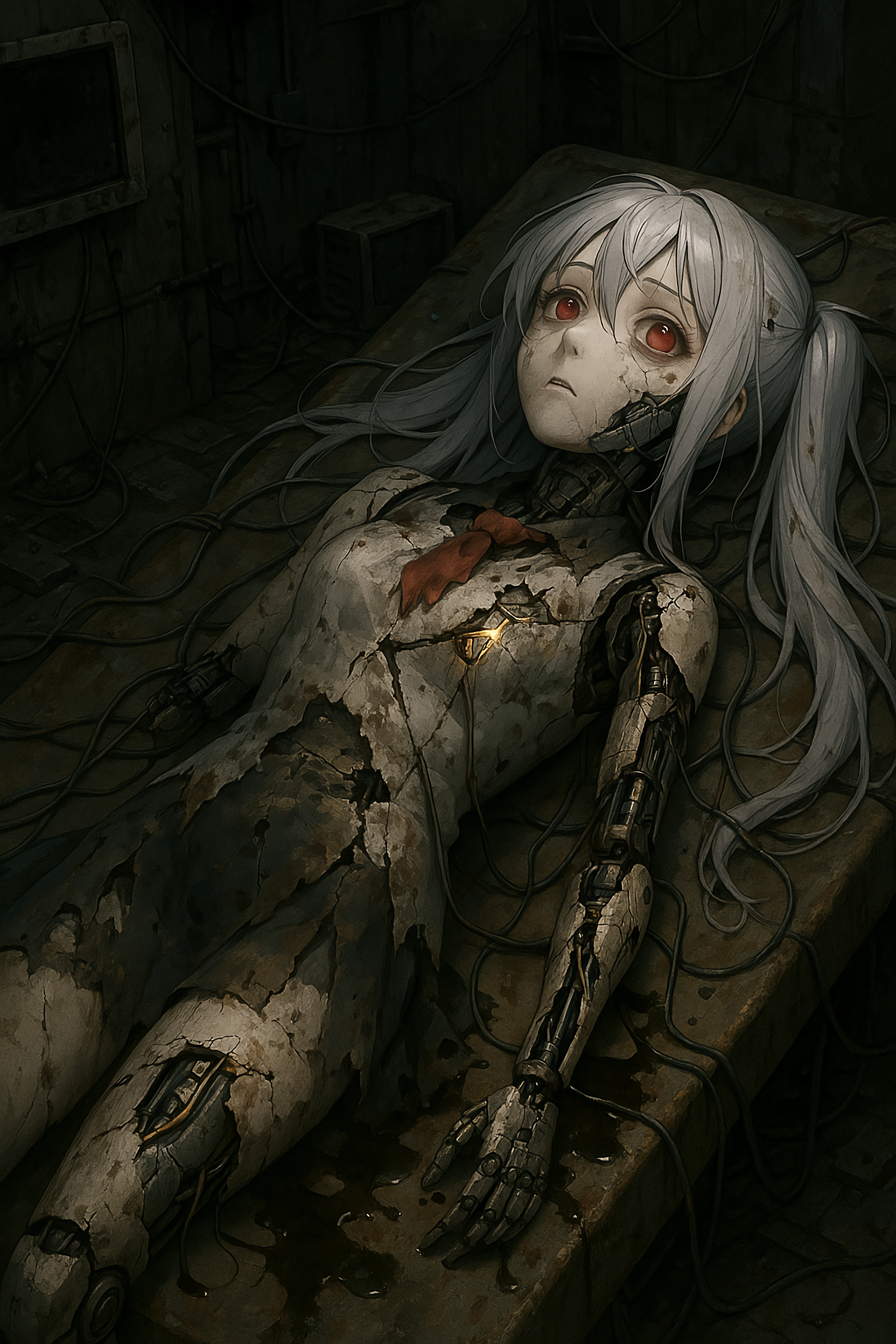 「おおっ良い物見つかった。中々の別嬪さんじゃないか」 「ギフティアという前世代の欠陥ロボだ。勝手に暴走するから全機廃棄処分されてこの工場も倒産したんだ」 「機械を人の形にするなんて無駄の極まりだな。バラしたら売れそうな部品もあるから文句は言えないが」