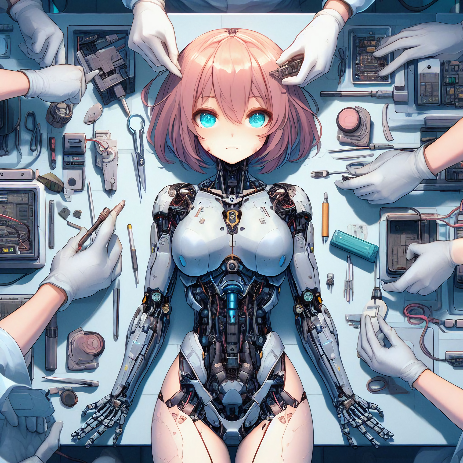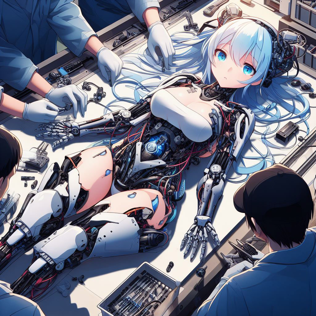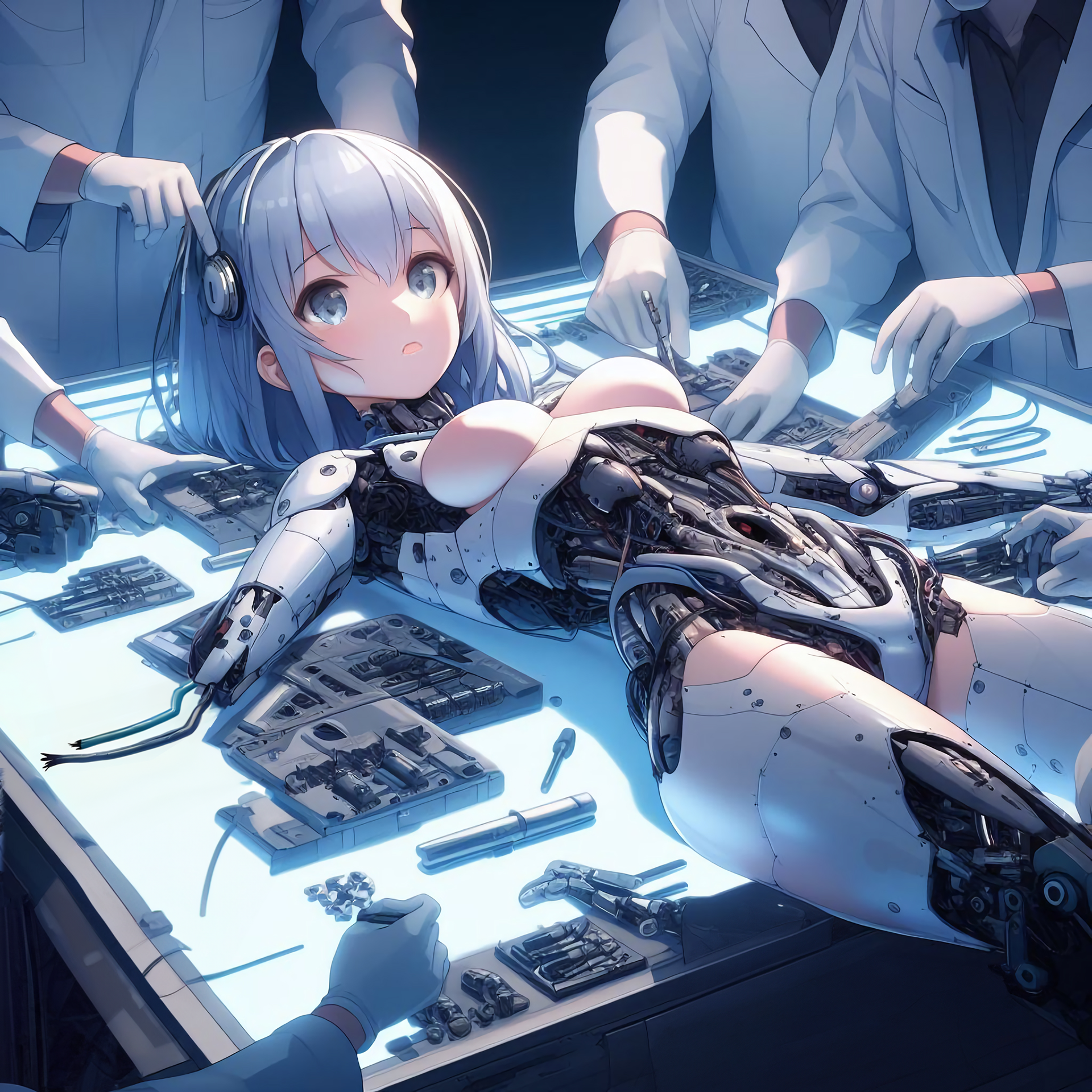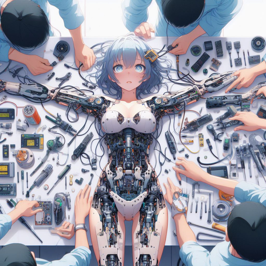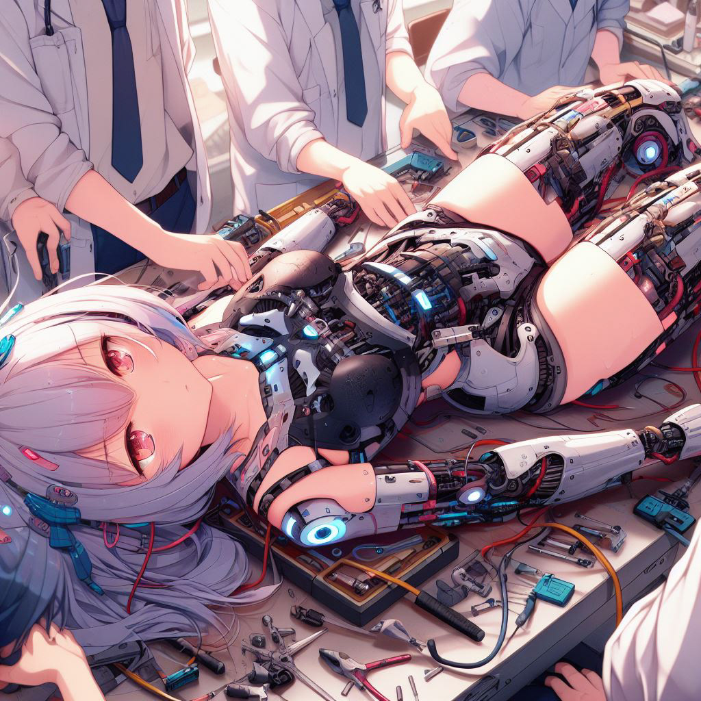 「この間我々のスパイがJ国の研究施設から拉致した試作機か」 「こんな新型機は貴重なサンプルだ。徹底的に解析して我が国の技術力を高めよう」 「じゃ所長の俺は頭の分解を担当する。電子脳と各種センサーの解析が楽しみだ。でも暴れたら困るからまず胸の電池を取り外してくれ」