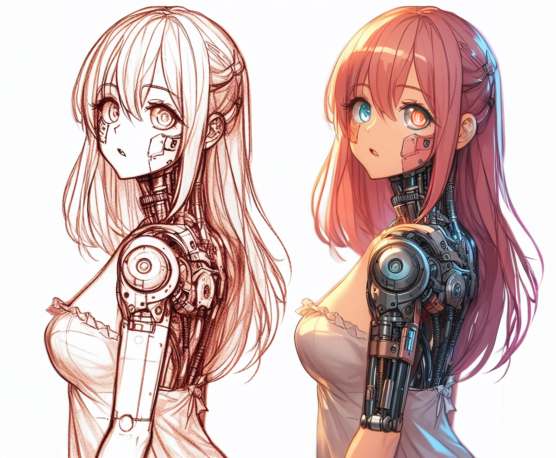 「どうしてこんなボロボロで廃棄直前の私の絵を描くんですか?旧型でろくにメンテもされてない私なんかより、ずっと美人で外装も綺麗な子がこの街にいくらでもいるのに…」 「貴女の内部機構が剥き出しになってる背中も、赤いレンズが丸見えで真っ直ぐなカメラアイも好きだから」